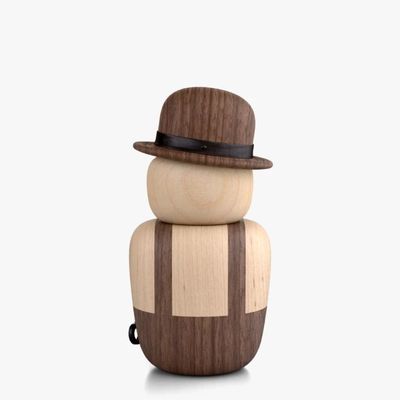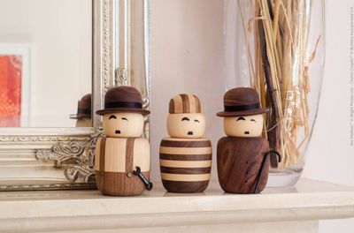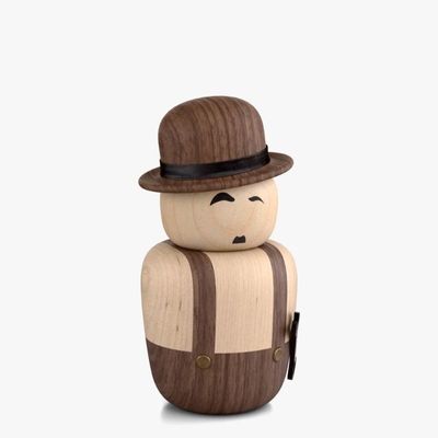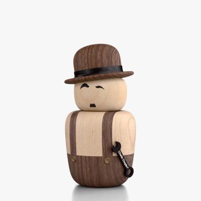 Using the dark walnut and light maple woods the characters instantly portray that classic black and white film look, with his overalls and spanner, and Chaplin’s iconic moustache and raised eyebrow.